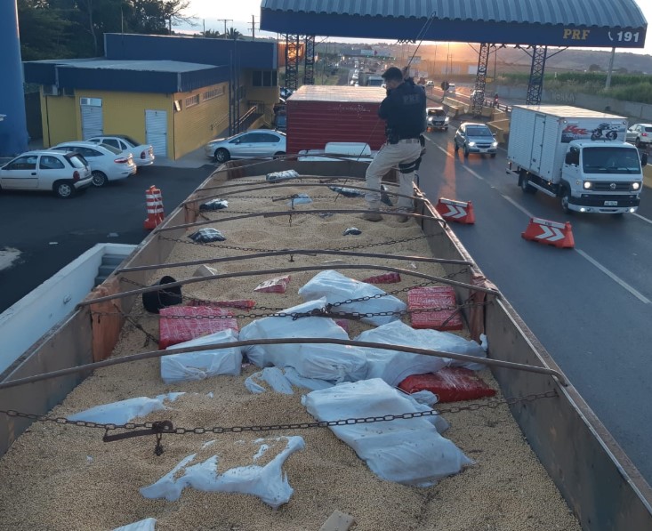Os policiais, então, subiram na carreta, que estava carregada com 30 toneladas de soja e descobriram vários fardos de maconha em meio ao carregamento.